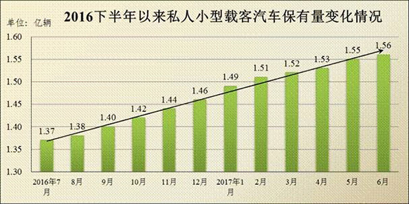 小型载客汽车保有量达1.68亿辆,私家车持续快速增长。截至6月底,小型载客汽车保有量达1.68亿辆,其中,以个人名义登记的小型载客汽车(私家车)达1.56亿辆,占汽车总量的76.32%,2016年下半年以来月均增加164万辆,呈持续快速增长趋势。
