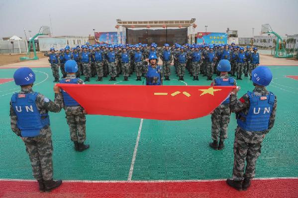 当地时间7月30日,伴随着清晨的第一缕阳光,全副武装的维和官兵整齐列队、姿态端庄。护旗方队迈着铿锵有力的步伐走向升旗台,随着激昂的国歌声响起,撒旗手奋力挥臂将国旗撒向空中,维和官兵们向国旗致以庄重的军礼。