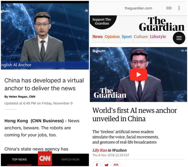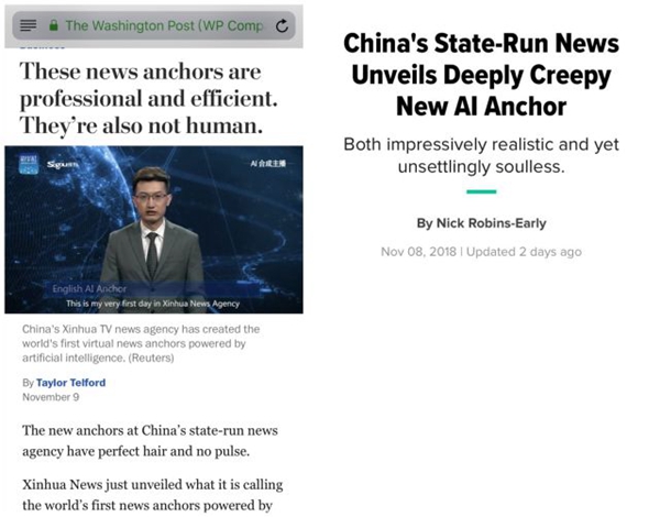 ↑美国《华盛顿邮报》、美国《赫芬顿邮报》关于“AI合成主播”的相关报道
