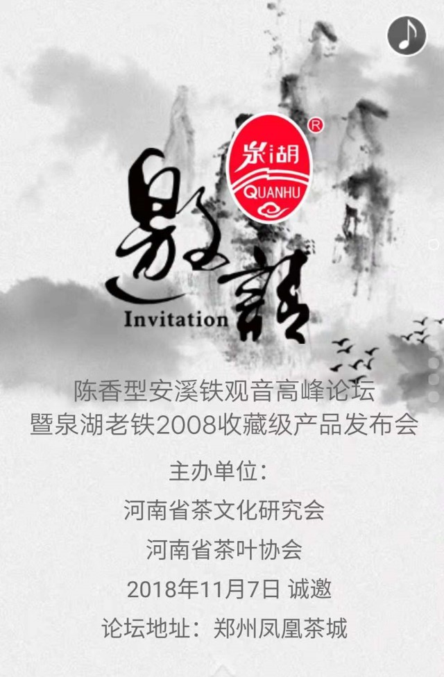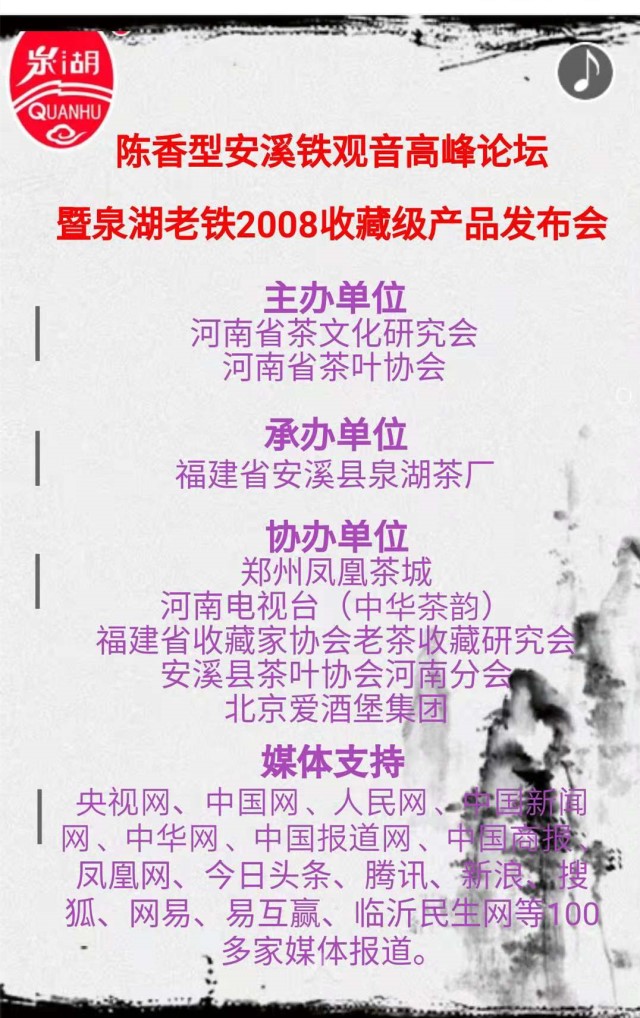 由河南省茶文化研究会、河南省茶叶协会主办,福建省安溪县泉湖茶厂承办,郑州凤凰茶城、河南电视台(中华茶韵)、福建省收藏家协会老茶收藏研究会、安溪县茶叶协会河南分会、北京爱酒堡集团协办的陈香型“安溪铁观音高峰论坛”暨泉湖老铁2008收藏级产品发布会近日在郑州举办。