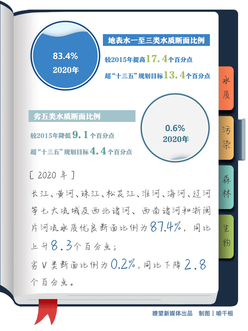 碧水更多,水质更优良。地表水Ⅰ至Ⅲ类水质断面比例由66%上升至83.4%,提高17.4个百分点,超过“十三五”规划目标13.4个百分点;劣Ⅴ类水质断面比例由9.7%下降到0.6%,降低9.1个百分点,超过“十三五”规划目标4.4个百分点。