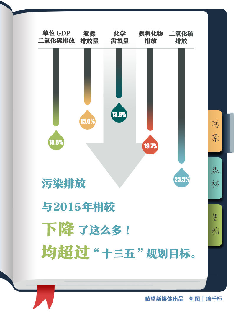 污染更少,减排更有效。二氧化硫、氮氧化物、化学需氧量、氨氮排放量较2015年分别下降25.5%、19.7%、13.8%、15.0%,单位GDP二氧化碳排放较2015年降低18.8%,均超过“十三五”规划目标。
