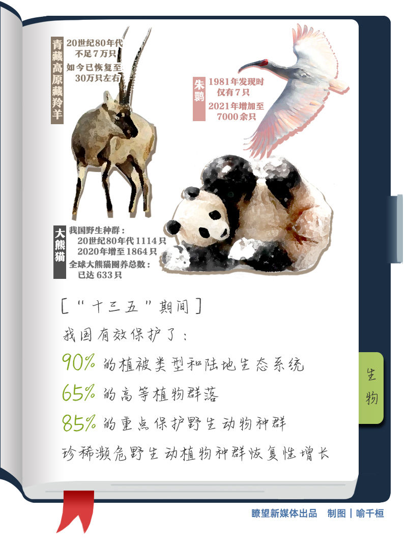 濒危野生动植物保护不断强化。“十三五”期间,我国有效保护了90%的植被类型和陆地生态系统、65%的高等植物群落,85%的重点保护野生动物种群,大熊猫、朱鹮、藏羚羊、苏铁等珍稀濒危野生动植物种群实现恢复性增长。