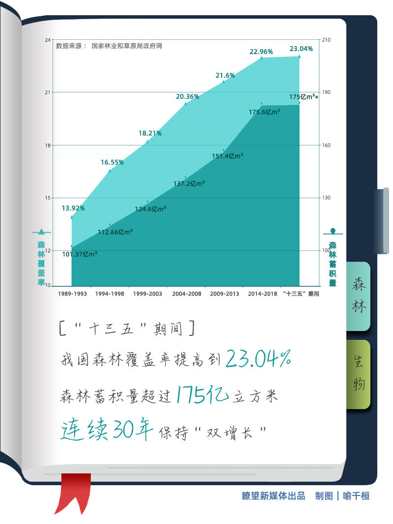 三北防护林、天然林保护、退耕还林还草等一系列重大生态工程深入推进。“十三五”期间,我国森林覆盖率提高到23.04%,森林蓄积量超过175亿立方米,连续30年保持“双增长”,成为森林资源增长最多的国家。