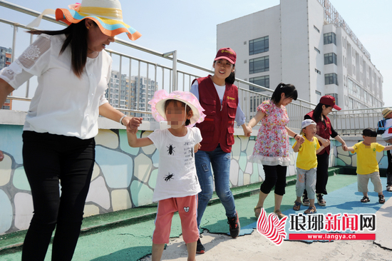 图为临沂日报报业集团青年志愿者在市康复中心工作人员陪同下,与孤独症儿童进行互动交流。