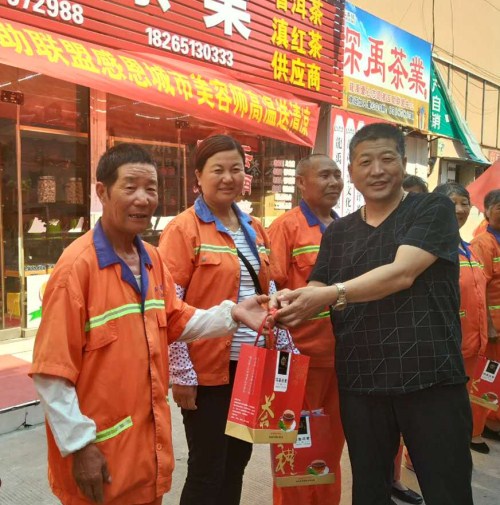 炎炎夏日,经常能看到大街上身穿橘黄色工作服的环卫工人冒高温酷暑坚守在工作岗位,早出晚归,辛勤劳动在城区的大街小巷,他们用“脏、苦、累”才换来了城市的“净、美、亮”。龍禹爱心志愿者互助联盟会长李学柏表示:“正值酷暑,当人们躲进空调屋纳凉时,我们的城市美容师——环卫保洁人员却头顶烈日,在道路上与高温高湿战斗。尊重环卫保洁,关爱环卫保洁,理当成为我们这座城市所有居民的良好习惯。为了感谢、关心、支持这些可敬可爱的人,我们龍禹爱心志愿者联盟为她们献上茶叶茶杯毛巾等,希望为他们在夏日酷暑工作中送去一丝清凉。”
