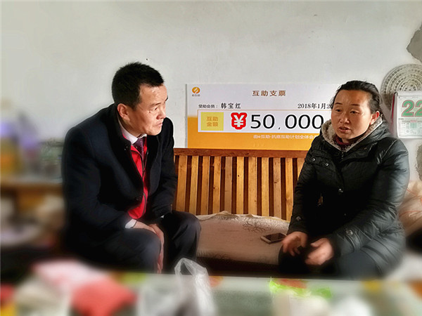 123,泛华临沂e互助携手临沂市生命关怀协会来到郯城县李庄镇,为e互助会员韩女士送来救助款5万元及部分慰问品,让这不幸的一家感到冬日里的温暖。
