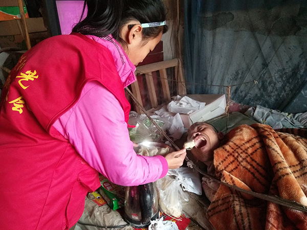 紧接着来到了莒南县石莲子镇大屯村的邹风强家。邹凤强,今年47岁,孤身一人,父母双亡,患病多年,因一次意外摔倒卧床七年,仅靠一老姐姐艰难度日;志愿者来到邹家时,院子里都是落叶,一部分志愿者把院子给打扫了,看到躺在床上的邹风强,另一部分志愿者们给他现场包的水饺喂给他吃。