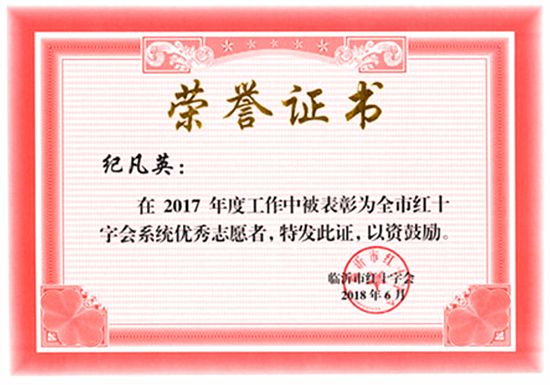 2018年8月28日下午,临沂市红十字会召开五届理事会第二次会议暨2017年度全市红十字会系统先进集体和先进个人表彰大会。临沂市人民医院健康教育中心主任纪凡英被授予全市红十字会系统优秀志愿者称号。