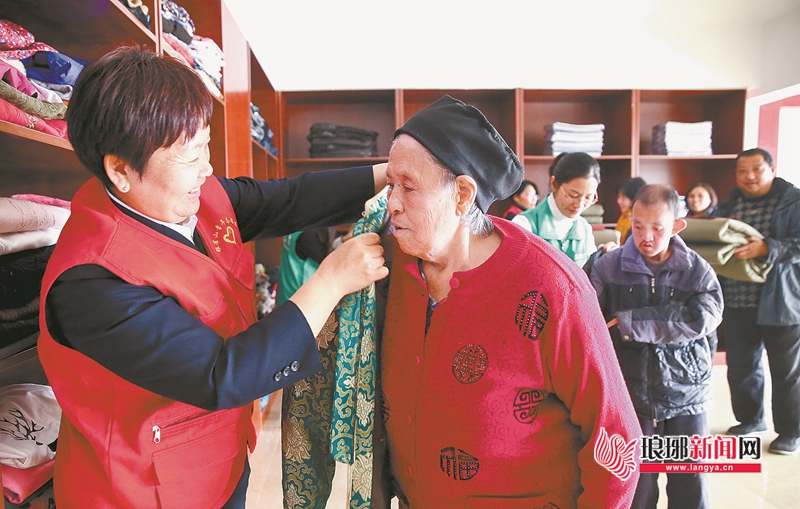 11月28日,在临沂市兰山区银雀山街道东苗庄社区慈善中心,贫困老人在志愿者的帮助下试穿新衣。当日,东苗庄社区慈善中心举行慈善年会,向社会弱势群体进行救助。社区爱心企业和个人踊跃捐款,共募集资金1354.64万元以及价值3万余元的棉衣、棉被等物资。