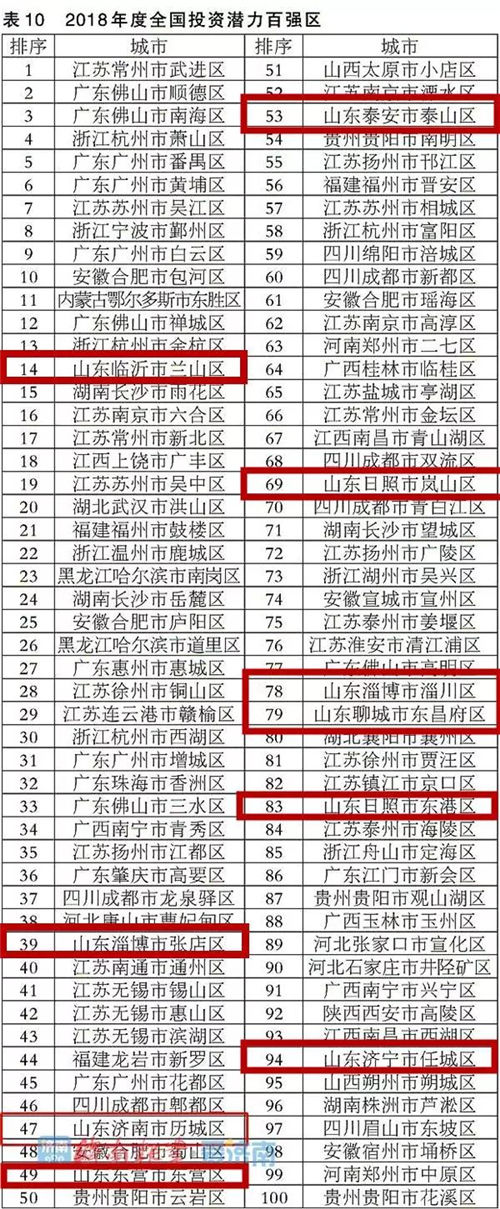 投资潜力指数,投资潜力研究侧重于对蕴涵在区域这一综合体中的投资环境和投资机会的发掘,努力引到区域发展方向,并对投资决策提出建议。投资潜力评价指标体系包含五方面指标:人口和劳动力、基础设施、交通区位、生态环境和营商环境。在2018年度全国投资潜力百强区中,山东临沂兰山区等10个城区上榜。