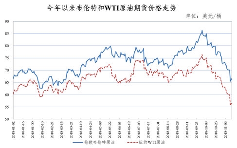 受沙特增产、美国原油库存超预期增长、美国放宽对伊朗制裁、需求预期下滑等一系列因素影响,国际油价大幅下降。目前布伦特、WTI油价分别降至每桶66美元和56美元,较十月初的四年高位下降约20美元,降幅达23%、26%。