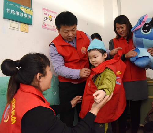 2017年4月6日,白血病男孩朱立帅康复出院,志愿者为白血病男孩朱立帅穿上特制的马甲,圆了孩子当志愿者的梦想。