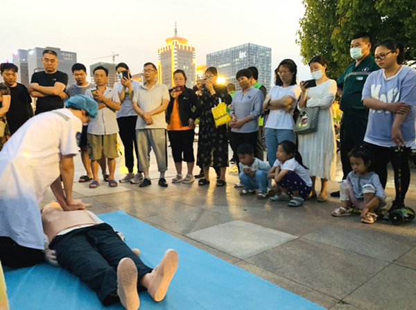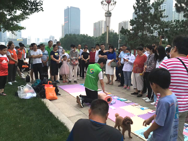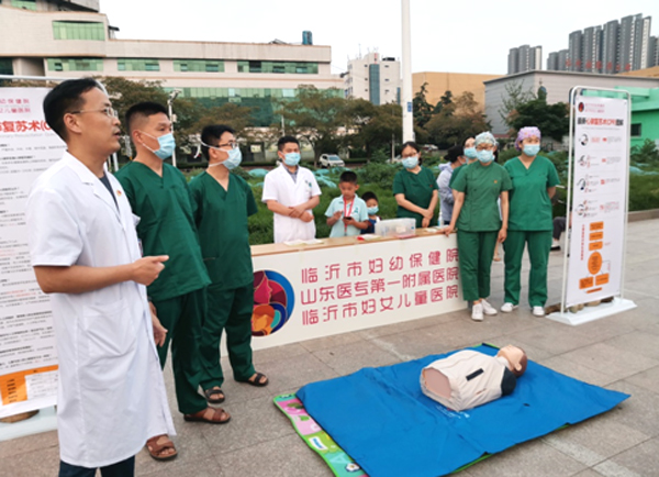 在临沂市人民广场,来自临沂市人民医院的医务人员为市民开展心肺复苏、中医刮痧以及健康咨询服务,普及户外活动急救必备技能,提供专业的妇产儿科、老年人的健康管理知识咨询。通过现场演示、发放宣传单、集中宣讲等方式向群众宣传急救知识和疾病预防知识知识。