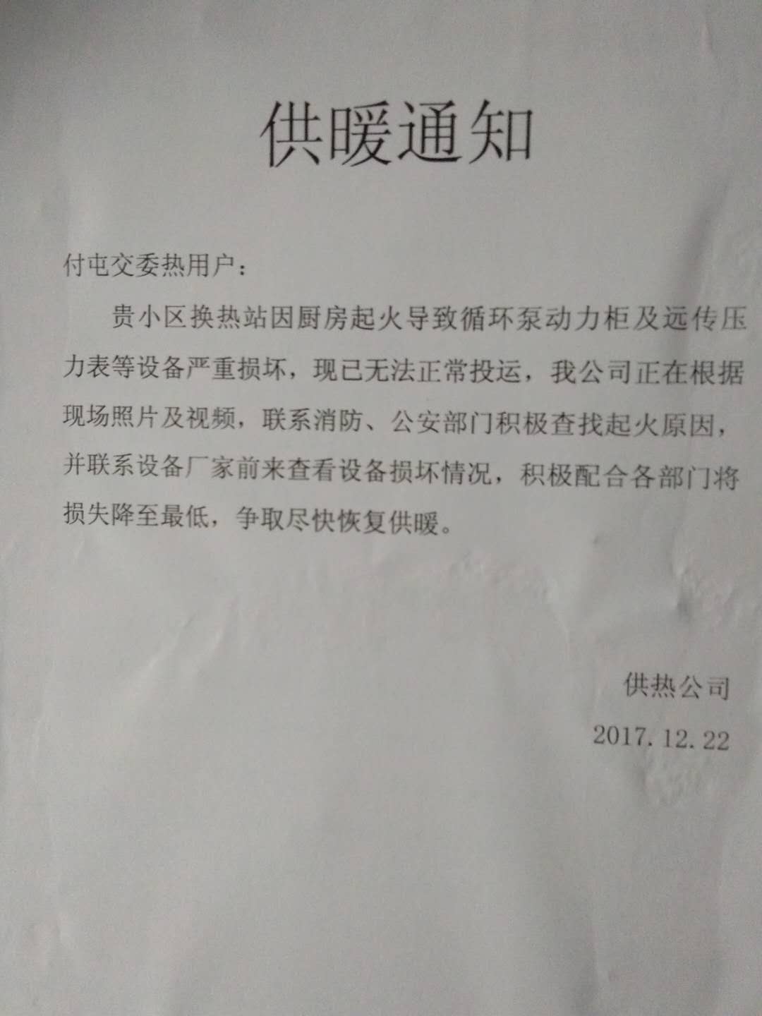 位于临沂市兰山区金源路与八一路交会处付屯居委1001号的临沂市交通局家属院,自2017年12月21日晚因漏电发生火灾导致停止供暖。自此已近一周,市交通局、物业、恒源热力多方协调无果,院内居民特别是年老体弱的老人和孩子已有10多位因室内温度低感冒住院、服药等。望相关部门关注民生,让小区居民冬天不冷,度过一个祥和,温馨的元旦!