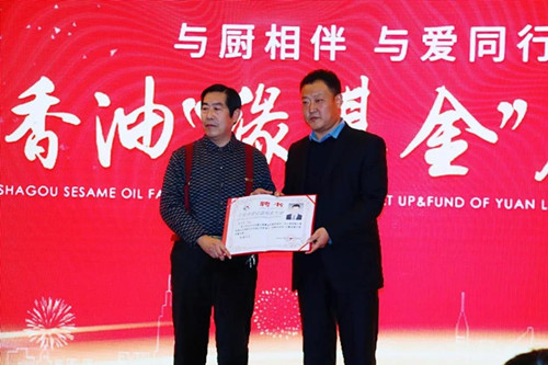 多年来,沙沟香油在悠久历史沉淀的基础之上,坚守良心品质,不断创新技术,如今已成为稳居国内销量前三甲的小磨香油行业龙头品牌!拥有大批忠实客户和口碑实力俱佳的合作伙伴。而今天沙沟香油旗下品牌菜缘香油厂店直供联盟与缘基金的隆重成立,也是沙沟香油企业发展过程中迈出的极其重要的一步。临沂市社会爱心联合会李波会长为沙沟香油董事长李守军颁发“沂蒙关爱公益形象大使”荣誉证书。