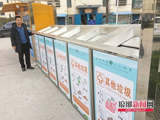 兰山区柳青街道环卫所所长白传峰自制的密闭分类垃圾箱设置在赵岔河社区。
