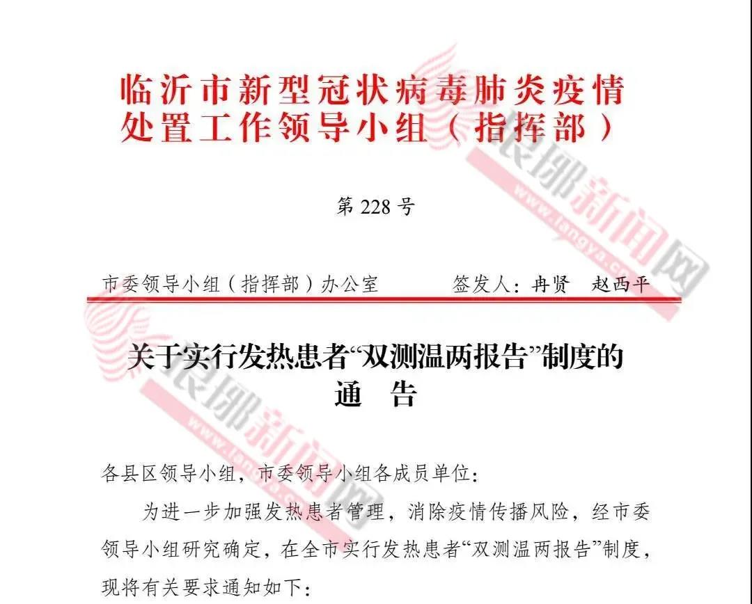 3月6日,市委新冠肺炎疫情处置工作领导小组(指挥部)办公室下发《关于实行发热患者“双测温两报告”制度的通告》,在全市实行发热患者“双测温两报告”制度。