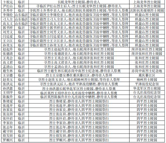 记者了解到,成功找到亲人的这1125名烈士中,有临沂籍的21名烈士。经过梳理发现,还有107名临沂籍烈士未能找到亲人。这些烈士有的是在淮海战役中牺牲,有的是在台儿庄战役中牺牲,有的参加过南北岱崮保卫战,现在长眠于鲁东南革命烈士陵园、淮海战役纪念馆、沂南革命烈士陵园、台儿庄大战纪念馆、上海龙华烈士陵园、棋盘山烈士陵园等地。