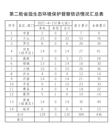 截至4月16日10时,省第六生态环境保护督察组分7批累计向我市转办群众信访举报436件。累计信访件为:市直9 件、兰山区76件、罗庄区34件、河东区(经开区)41件、 高新区24件、郯城县30件、 兰陵县36件、沂水县16件、 沂南县35件、平邑县33件、 费县22件、蒙阴县16件、莒南县(临港区)49 件、临沭县15件。