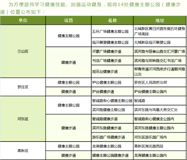 那么您知道这些健康主题公园(健康步道)在哪儿吗?为方便居民学习健康技能、加强运动健身,临沂市卫生健康委现将14处健康主题公园(健康步道)位置公布如下: