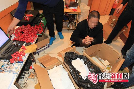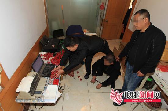 在这堆印章里,便衣民警现场发现了临沂市及各县区国税系统的公章,这个窝点俨然成了一个“地下国税局”。印章中还有大量房产公司、金融公司、汽修厂等多行业的公章和财务专用章。随着民警搜出的证据越来越多,嫌疑人的额头上不断冒汗。