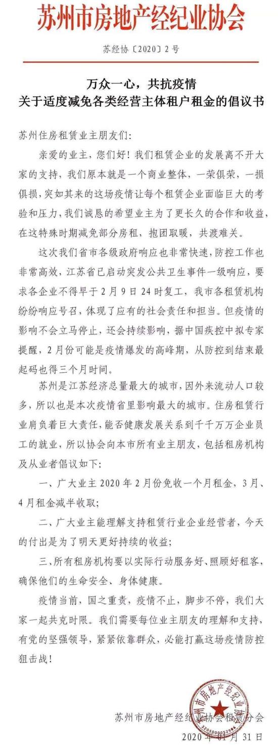 1月31日,苏州市房地产经济业协会发文,呼吁全市业主免收2月份一个月租金,3月份和4月份租金减半。