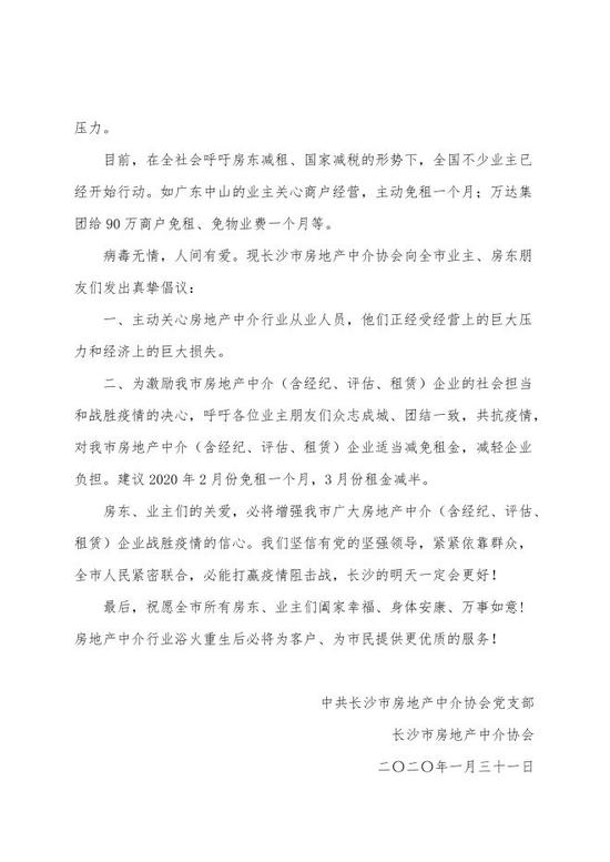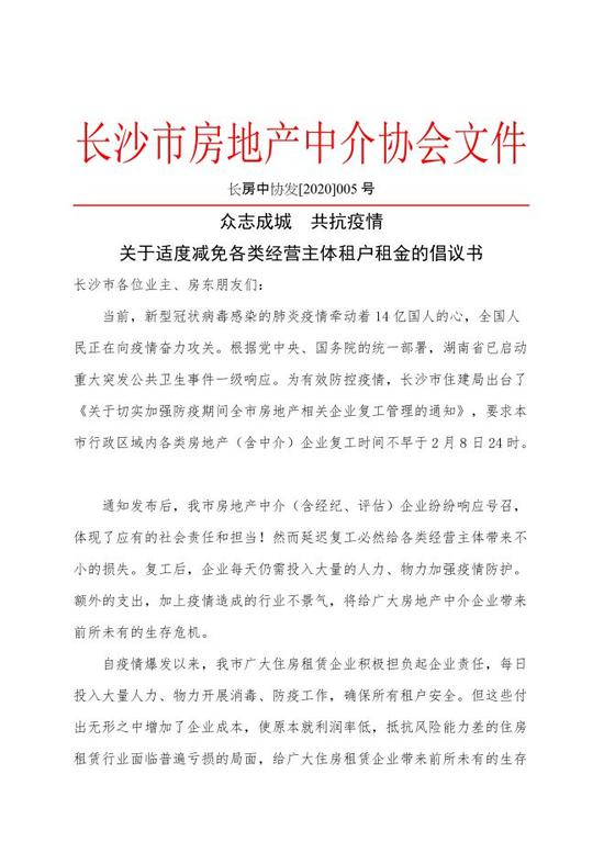 1月31日,长沙市房地产中介协会发文,倡议全市业主在疫情影响最重的2月份适度减免各类经营主体租户租金一月,3月份租金减半。