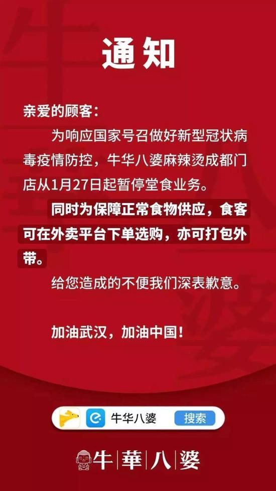 九毛九董事长管毅宏:1月24日起武汉市所有品牌所有门店暂停营业,1月26日起所有品牌所有门店全线暂停营业。公司也决定所有门店暂停营业期间所有待岗员工将按照正常出勤工资足额计发,集团受这次疫情影响的损失仍在统计中。
