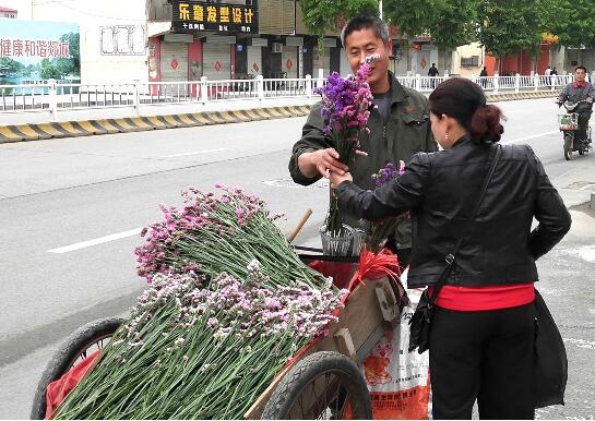 临沂民生网5月21讯:日前,在郯城县人民路大街上,这位拉着地板车卖干花的小老板,正高兴地接待又一位前来购买干花的顾客。据顾客介绍:花6元钱买一束的干花康乃馨,摆放在家里至少能插上两年,观赏期长,也有韵味,比花几元买鲜花插几天更划算。