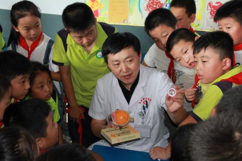 911日,在兰山区白沙埠镇中心小学,来自鲁南眼科医院的专家俎训山近距离给孩子们讲解眼球的构造。当日,临沂市爱眼护眼教育基地暨鲁南眼科医院爱眼护眼巡讲第十站走进当地农村学校,通过视频短片、动漫展示、互动问答等生动活泼、丰富多彩的形式,普及爱眼护眼知识,倡导孩子们正确科学用眼,用心呵护眼睛,维护视力健康。(王伟勋 孙艳伟 摄)