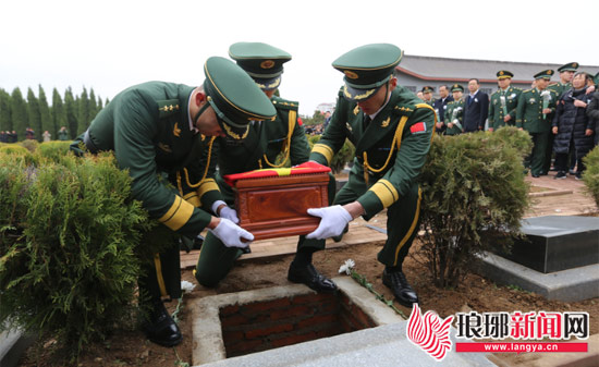 礼兵将王成龙烈士骨灰轻轻放入墓穴