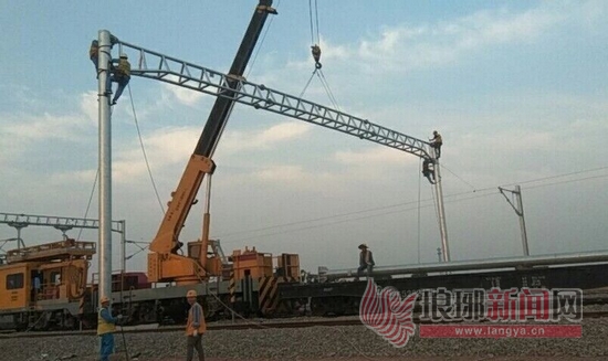 至此,鲁南高铁临沂北动车所第一阶段的44组硬横梁架设全部完成,为后续接触网施工提供有利条件。