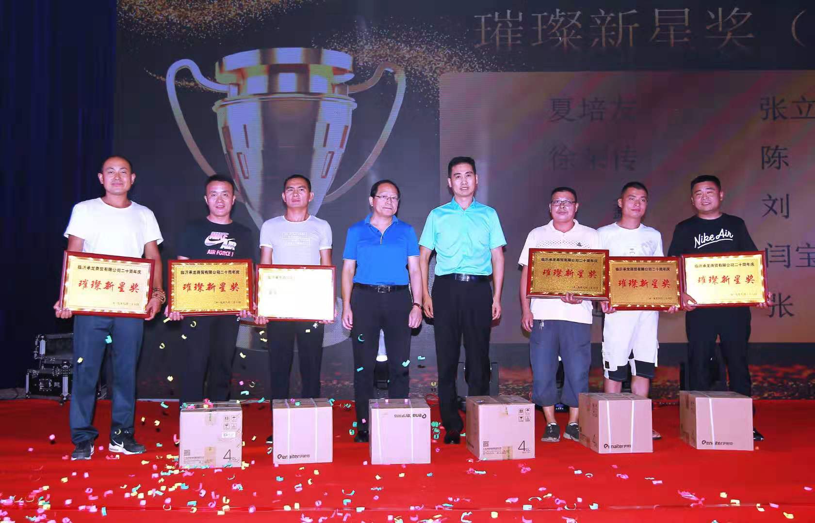 公司多元化发展离不开广大客户的鼎力支持,随着公司的不断发展今年以来临沂承龙商贸更是成功代理皇马品牌服装和易脑科学教育项目,并于当晚的周年庆典大会上进行了分享,为了感恩广大客户的支持公司对前来参加交流会的客户颁发了璀璨新星奖、精诚合作奖、风雨同舟奖等奖项,最后活动在黄金100秒歌手引领大家共唱同一首歌中落下帷幕。