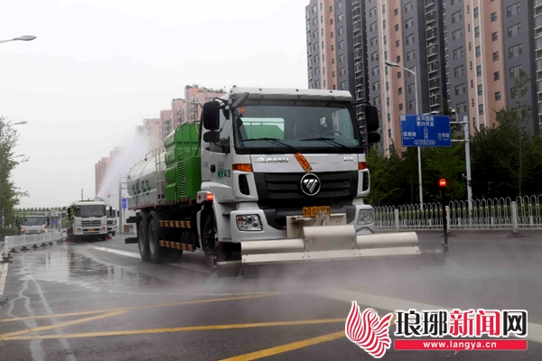 一辆辆雾炮车、高压对冲车、强洗车、洗扫车等先进的环卫机械压茬联合作业……