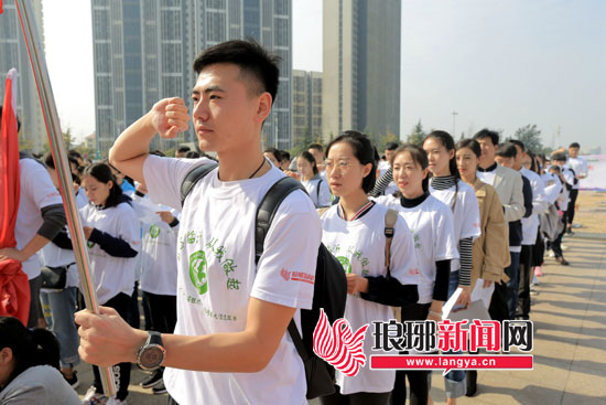 上午10点活动正式开始。蔚蓝的天空、美丽的白云、微凉的秋风中,首届魅力临沂环保形象大使选拔赛冠军张悦,带领千名环保志愿者庄严宣誓:“我们,作为自然保护的使者,将以我们的力量,还河流以清澈;将以我们的力量,还山川以绿色;将以我们的力量,还大地以生机;将以我们的力量,还天空以蔚蓝。让山更绿,水更清,天更蓝,用青春的活力与激情,奏响追求绿色与和谐梦想的乐章!”环保志愿者们的决心和信心,随激情豪迈的誓言直冲霄汉。