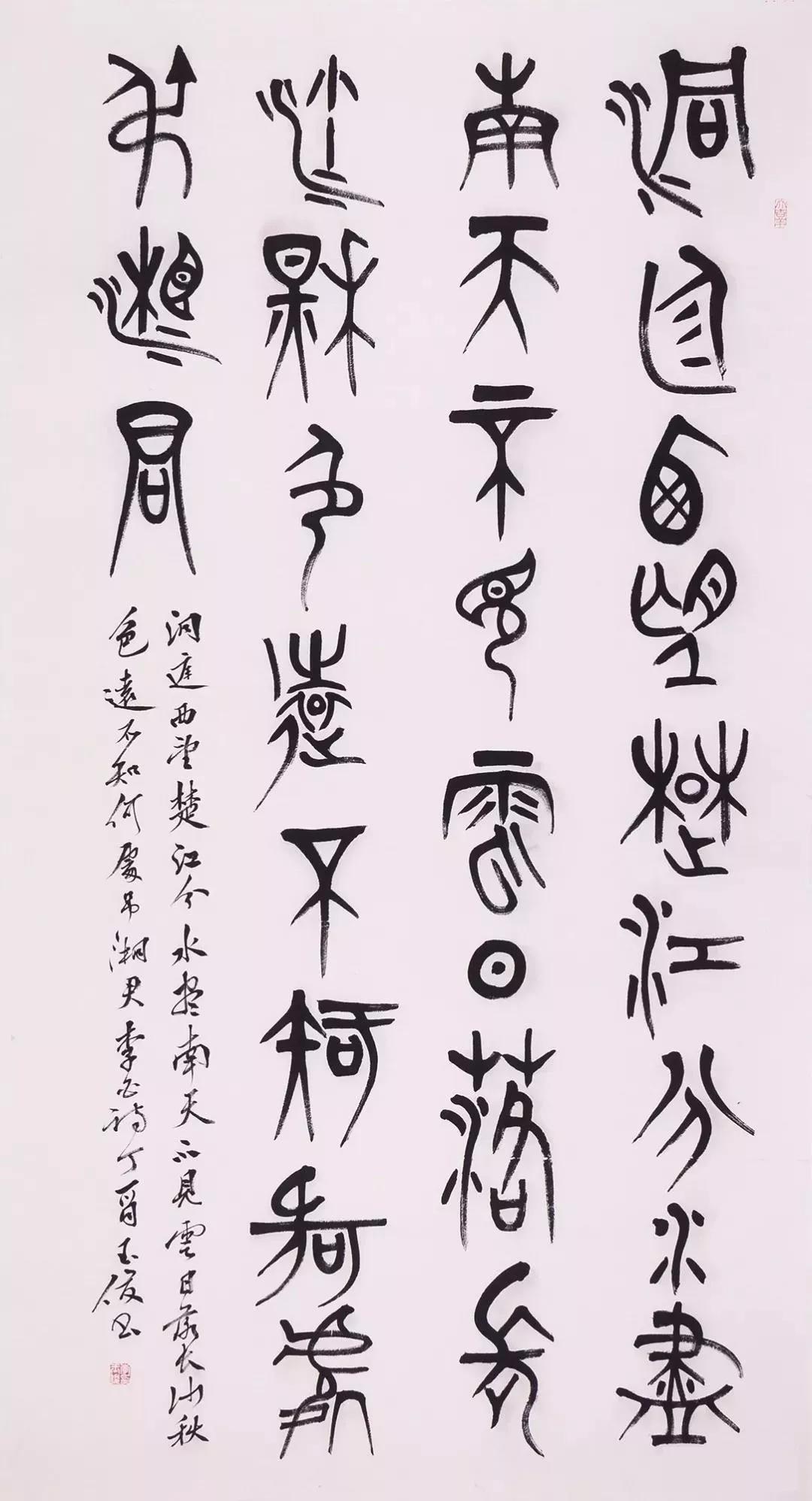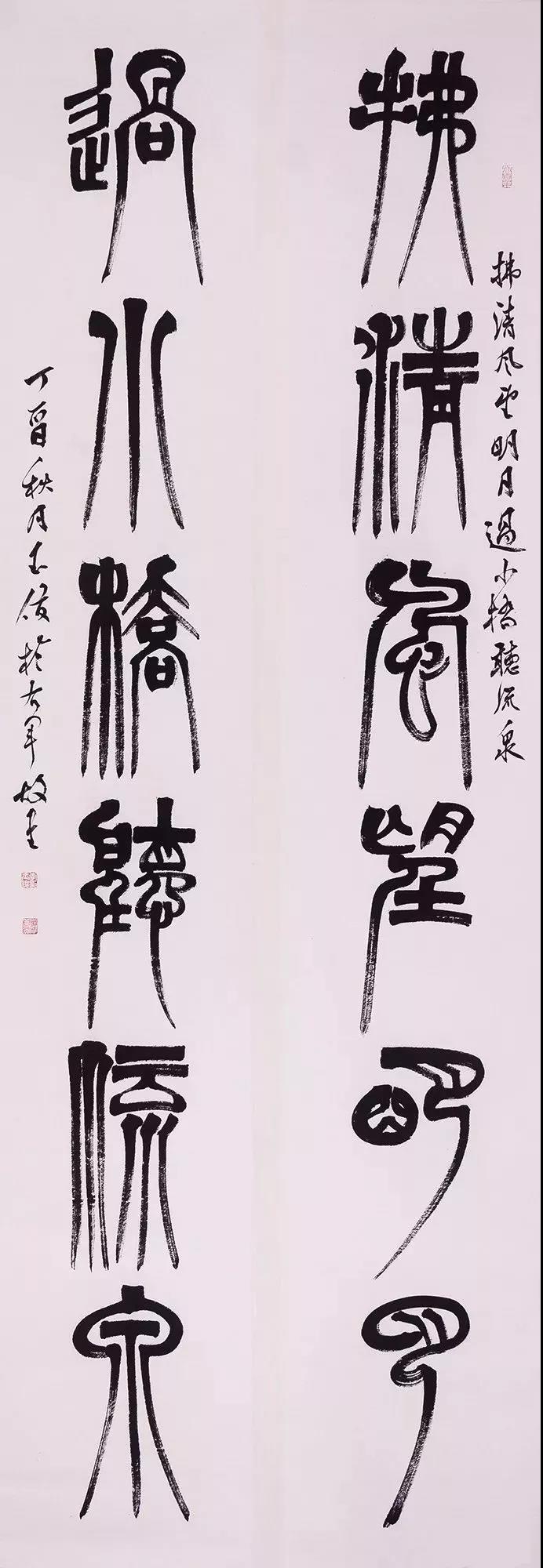 最有创意的应该是他的篆书,以小篆的书体出现,借鉴商周古籀及明清篆书的精华,尤其受邓石如影响极深,同时又将魏碑和清代金农的方笔融汇其中,用笔方圆并施,行笔流畅,疾涩相间,字形上紧下松,一个挺拔、一个秀丽,古朴大方,高古淡雅,隽永大气,即存金石之气又怀文人书卷之风,形成了他自己独特艺术风格。