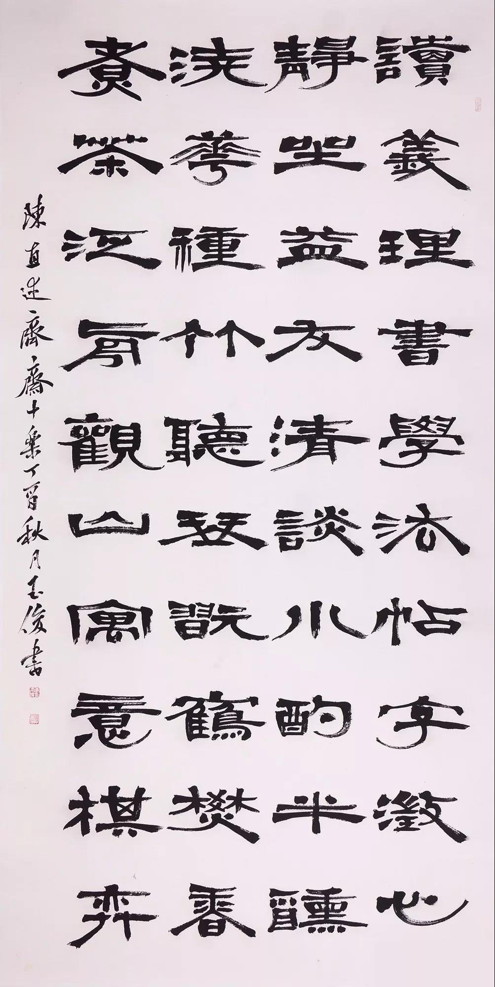 隶书以汉隶为基,借鉴篆书和汉简精华,显得典雅高古,运笔用墨,干湿浓淡,层次分明,虚实相间,韵味十足。