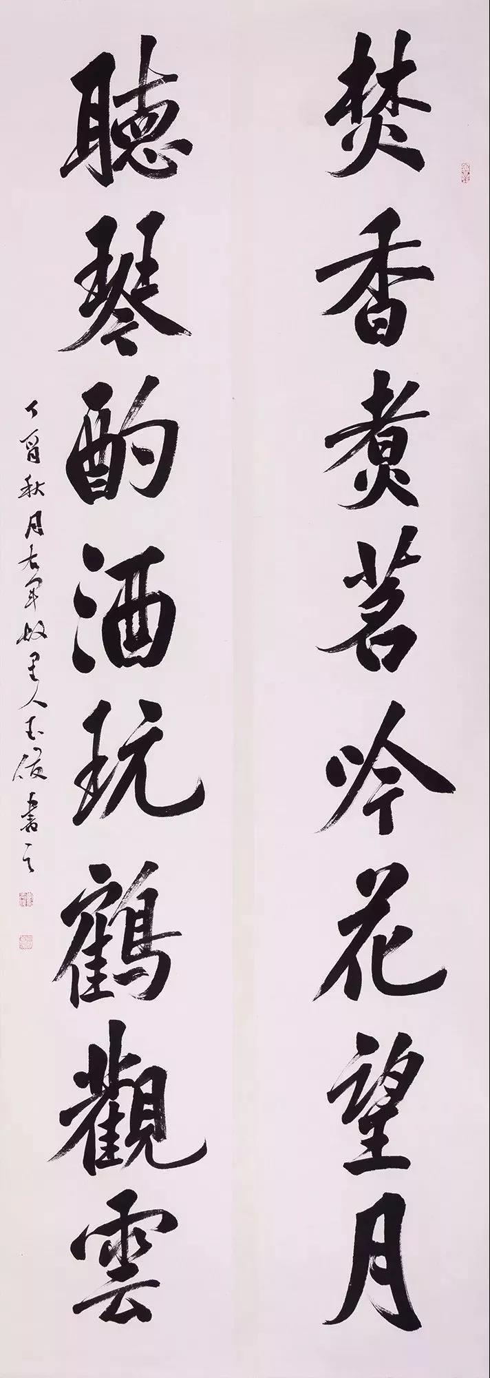 他的行书,取法二王,又借鉴了宋代黄庭坚、米芾的用笔,从结体到字形及章法,行云流水,起伏跌宕,风神潇洒,给人以流动之美感。