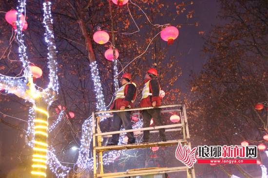 7日下午,解放路与沂蒙路交会处,临沂市城市照明管理处的施工人员正头戴安全帽、身披反光背心在路边忙碌,红灯笼在树枝挂起,闪光灯带在树干缠绕,解放路迎来最美夜晚。