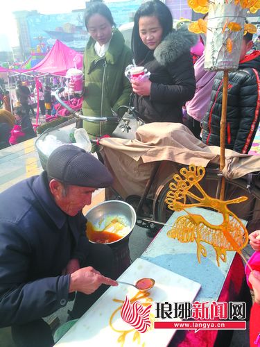 在临沂市平邑县莲花山公园门前,老人用汤勺舀起熬好的糖汁,在石板上飞快地来回勾划,缕缕糖丝变成了栩栩如生的花鸟鱼虫、飞禽走兽。刘进河说,他平均一天能卖出300余份,粗略算了算,一个春节假期能收入近万元。