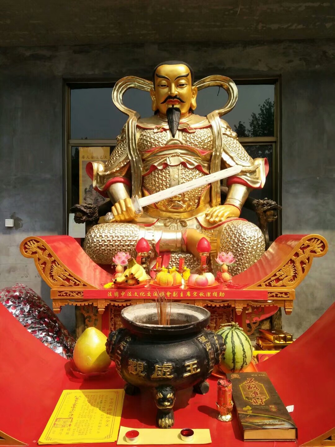 真武大帝,形象十分威猛,为道教信仰的镇守北方之天神。其身披长发、穿黑衣金甲、腰缠玉带、仗剑怒目、足踏龟蛇、顶罩神光。真武大帝受元始天尊敕命,率领三十六天将和五百护法灵官,巡游三界、纠察十方、仗剑度人、降妖伏魔。